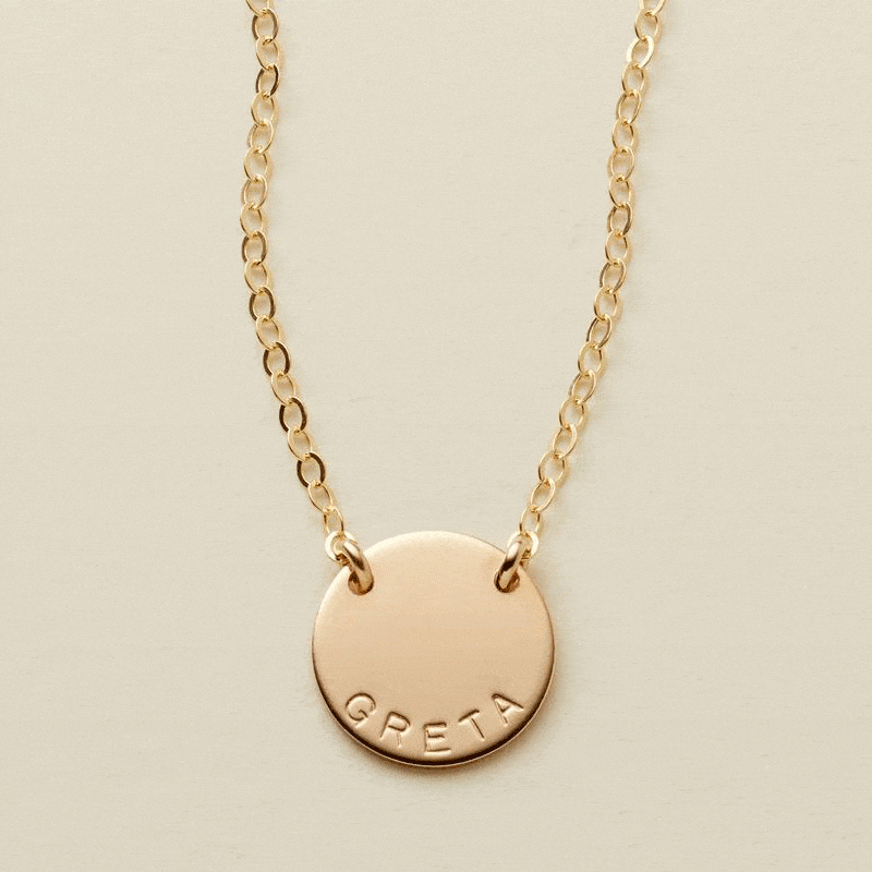 The Mini Zola is a unique take on our classic disc necklace. This disc necklace stays perfectly in place in the center of your chain, always. Build yo
